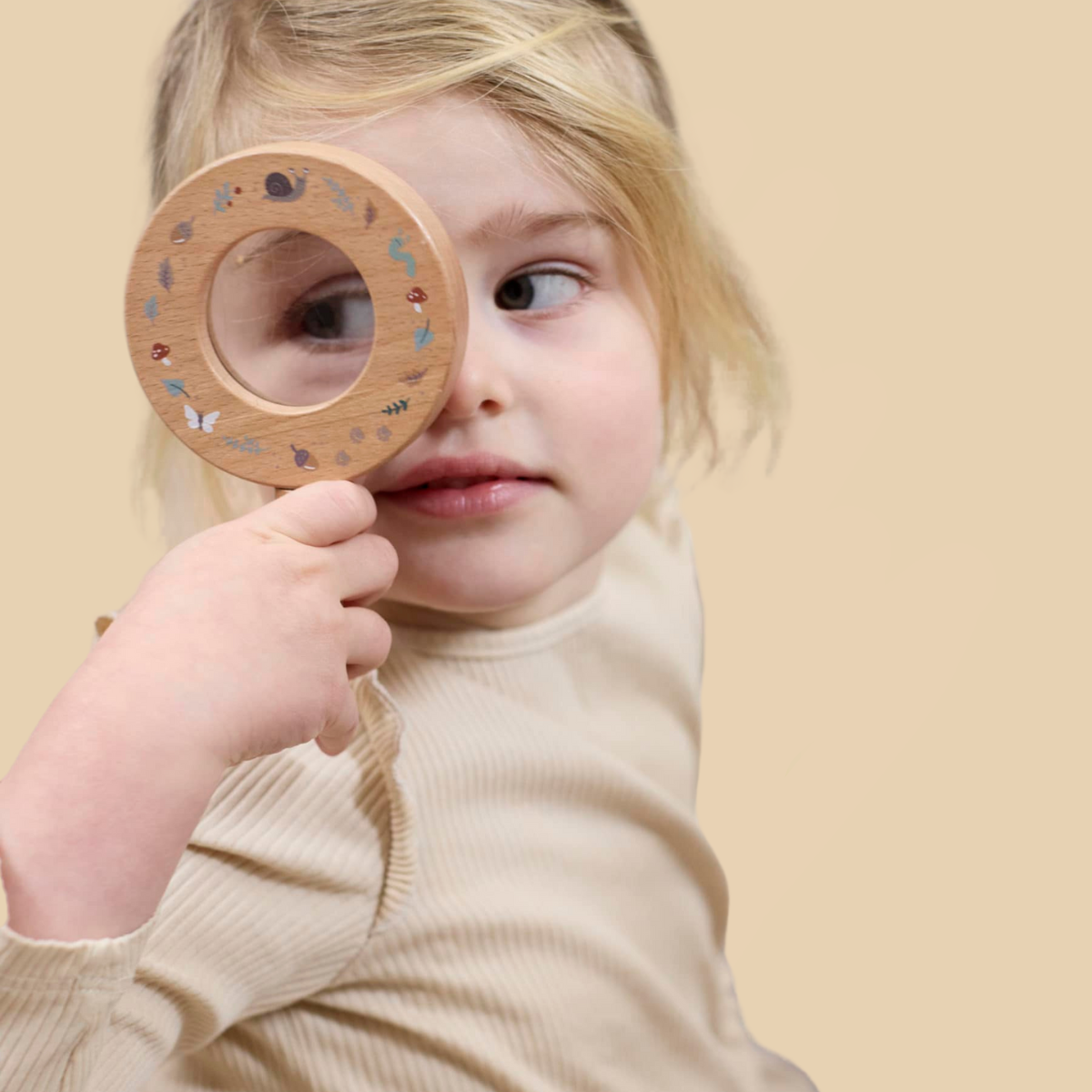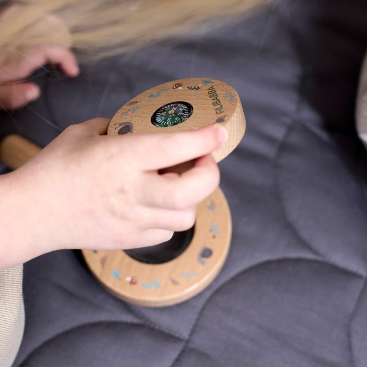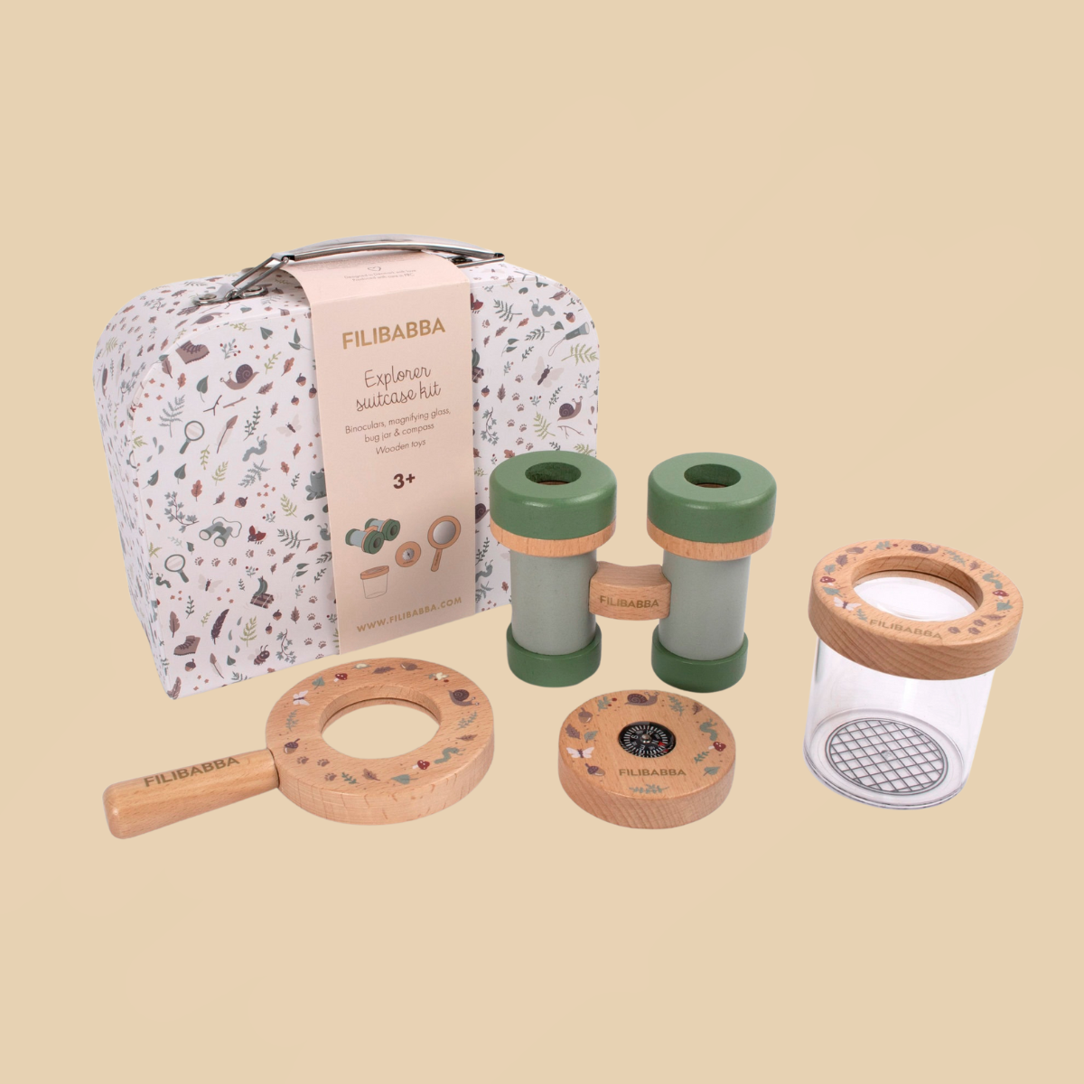 Tento kufřík obsahuje dalekohled pro objevování, nádobku na hmyz se zvětšovacím víkem pro detailní zkoumání, spolehlivý kompas a lupu pro zvídavé průzkumy. Každý kus je doplněn krásnými dřevěnými detaily, které mu dodávají kouzlo a autenticitu.
