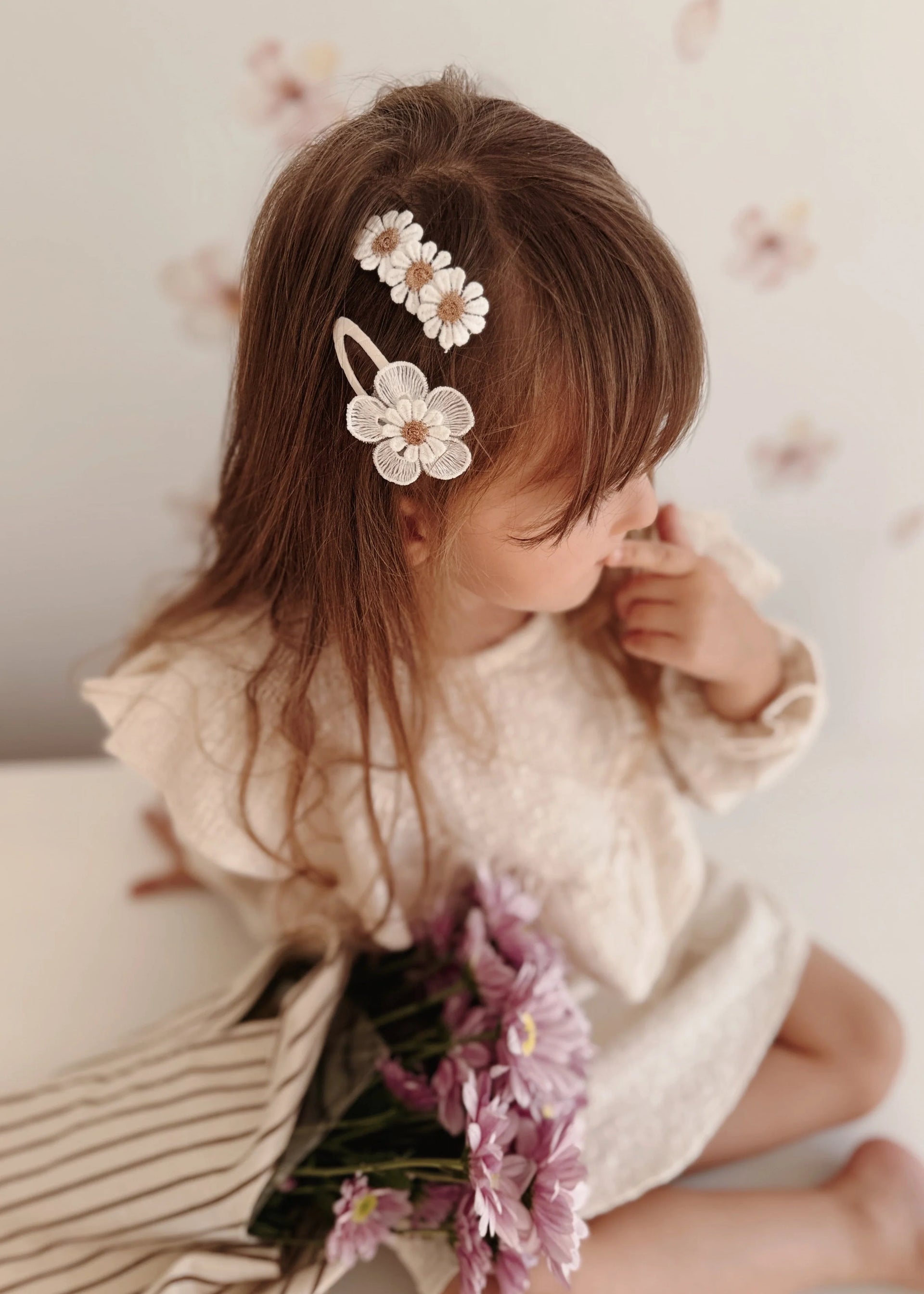Set čtyř látkových sponek je inspirovaný nadčasovou krásou kopretin s vintage nádechem. Hodí se pro malé slečny, které mají rády přirozený styl, ale potěší i maminky, které řeší každý detail.