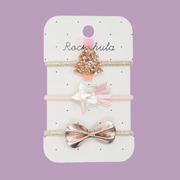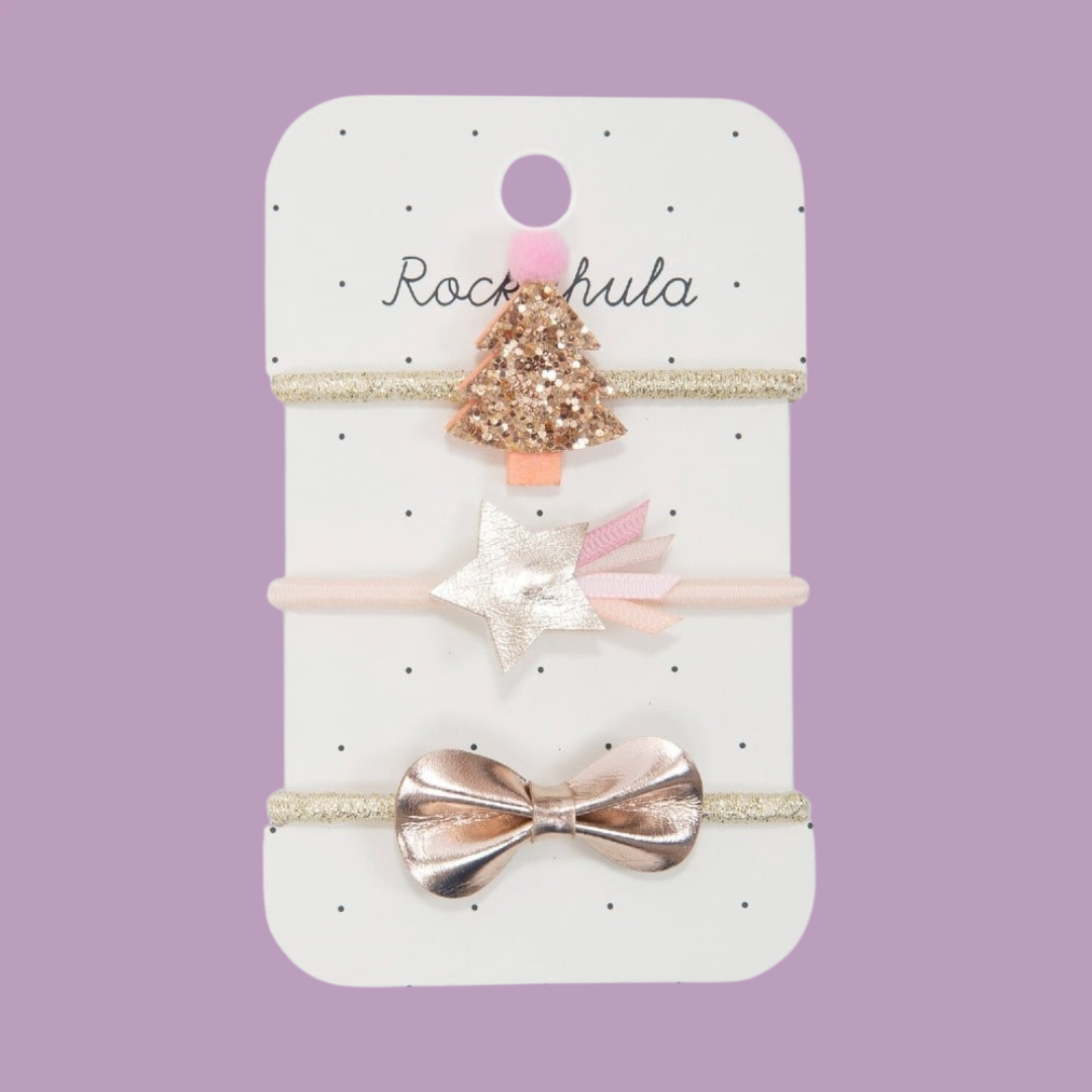 Rockahula roztomilá a slavnostní sada tří gumiček s vánočním stromkem, pěknou mašlí z růžového zlata a třpytivou padající hvězdou. Ideální pro navození sváteční nálady!