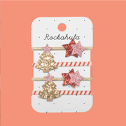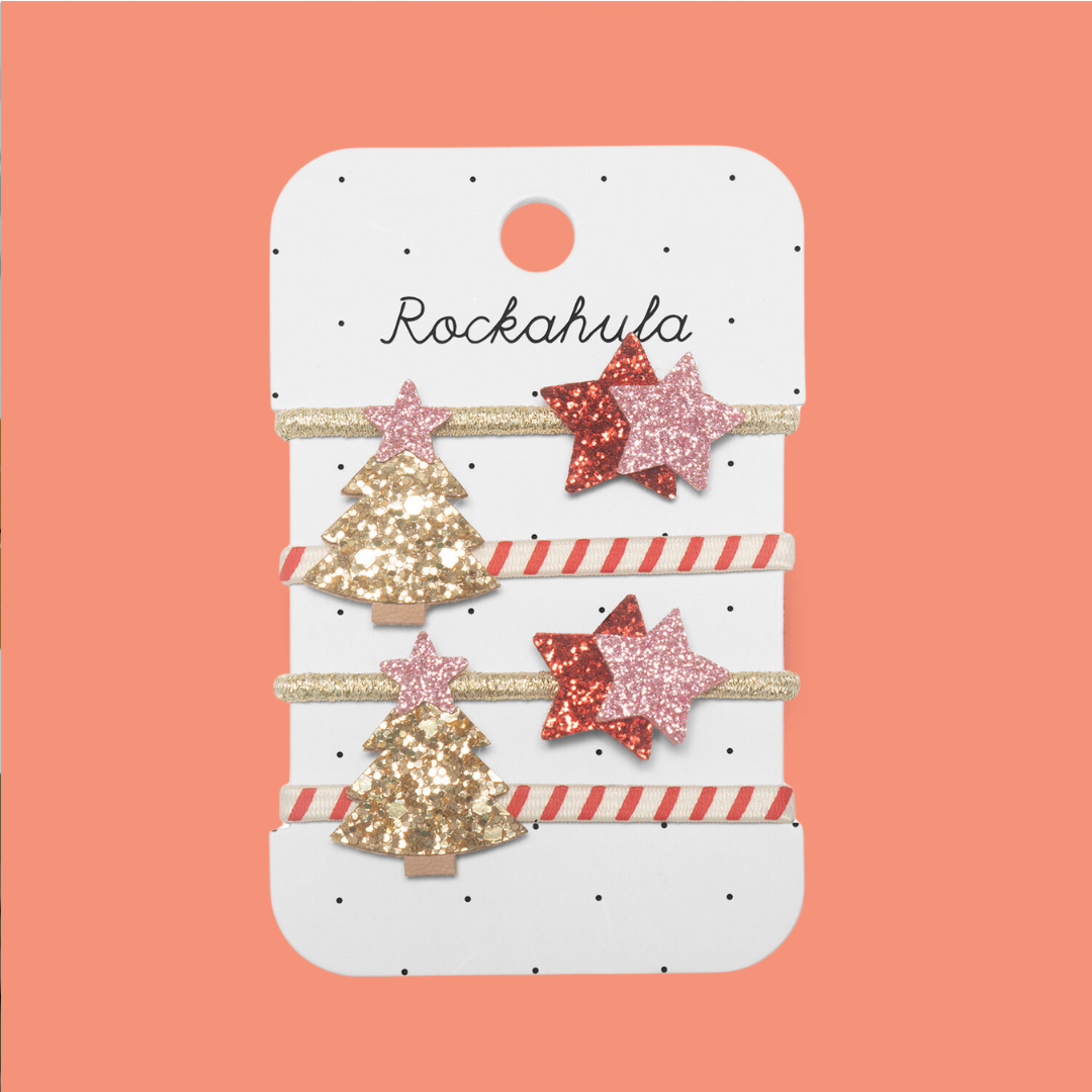Rozehrajte vánoční sezónu s těmito veselými gumičkami od Rockahula. Sada gumiček obsahuje dva zlaté vánoční stromečky s růžovými hvězdičkami a dvě třpytivé hvězdy. Všechny jsou upevněny na elastických gumičkách v červené, zlaté a krémové pruhované kombinaci. Dávejte je holčičkám jednotlivě, nebo všechny najednou pro extra vánoční šmrnc.