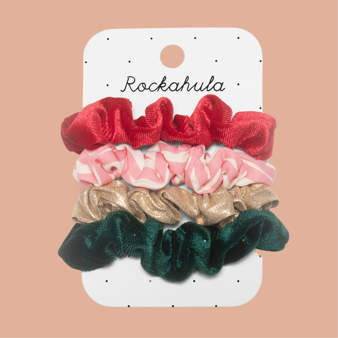 Dodejte vánočnímu outfitu vaší malé slečny kouzlo s touto sadou čtyř scrunchies. Rockahula Scrunchies jsou zpět v módě a nesmí chybět v žádném vánočním šatníku. Každá scrunchie je vyrobena z jiného materiálu – měkkého sametu v smaragdové zelené a tmavě červené, třpytivé zlaté látky a růžovo-bílé pruhované tkaniny. Tyto roztomilé gumičky do vlasů jsou perfektním doplňkem pro malé módní nadšenkyně.