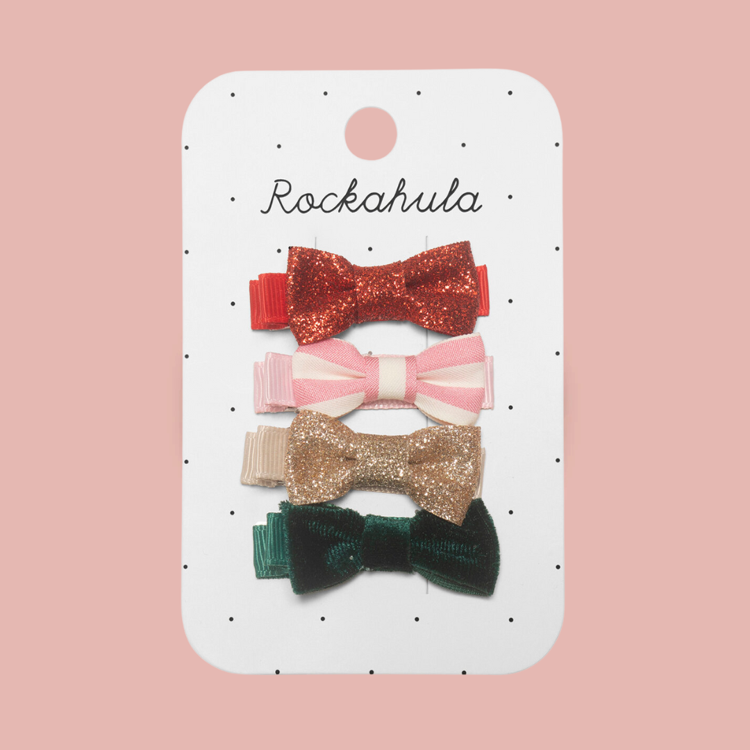 Rozveselte vánoční look své holčičky s těmito roztomilými mini mašličkami do vlasů Rockahula Jolly Christmas Mini Bow Clips. Sada čtyř pestrobarevných mašliček je ručně uvázaná a připevněná na sponkách, které jsou potažené jemnou grosgrainovou stuhou. Mašličky lze nosit jednotlivě nebo všechny najednou pro extra šmrnc.