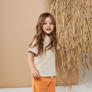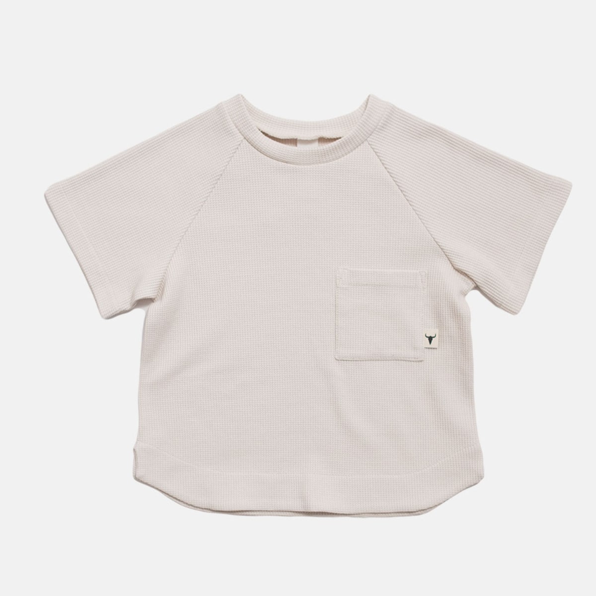 booso beige waffle tee is a loose children's t-shirt, ideal for comfortable wear in everyday life. Rounded hems with slits and a decorative pocket with a small label on the front give the tee an interesting look. It is made of high-quality knitwear in a small check pattern, which gives the trick a nice texture. The T-shirt is easy to combine with other pieces of clothing, making it ideal for many styles for both boys and girls. The color of the shirt is elegant beige. The composition is 94% cotton and 6% elastane, which ensures a comfortable fit and a good adaptation to the shape of the body.