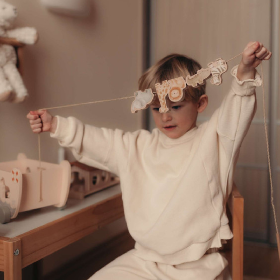 Tato montessori hračka rozvíjí jemnou motoriku, koordinaci ruka-oko i soustředění. Děti provlékají zvířátka pomocí provázku s dřevěnou špičkou, skládají je na loďku, zkoumají tvary, barvy a vytvářejí si vlastní příběhy. Bez tlačení. Bez hluku. Jen hra, která dává smysl.